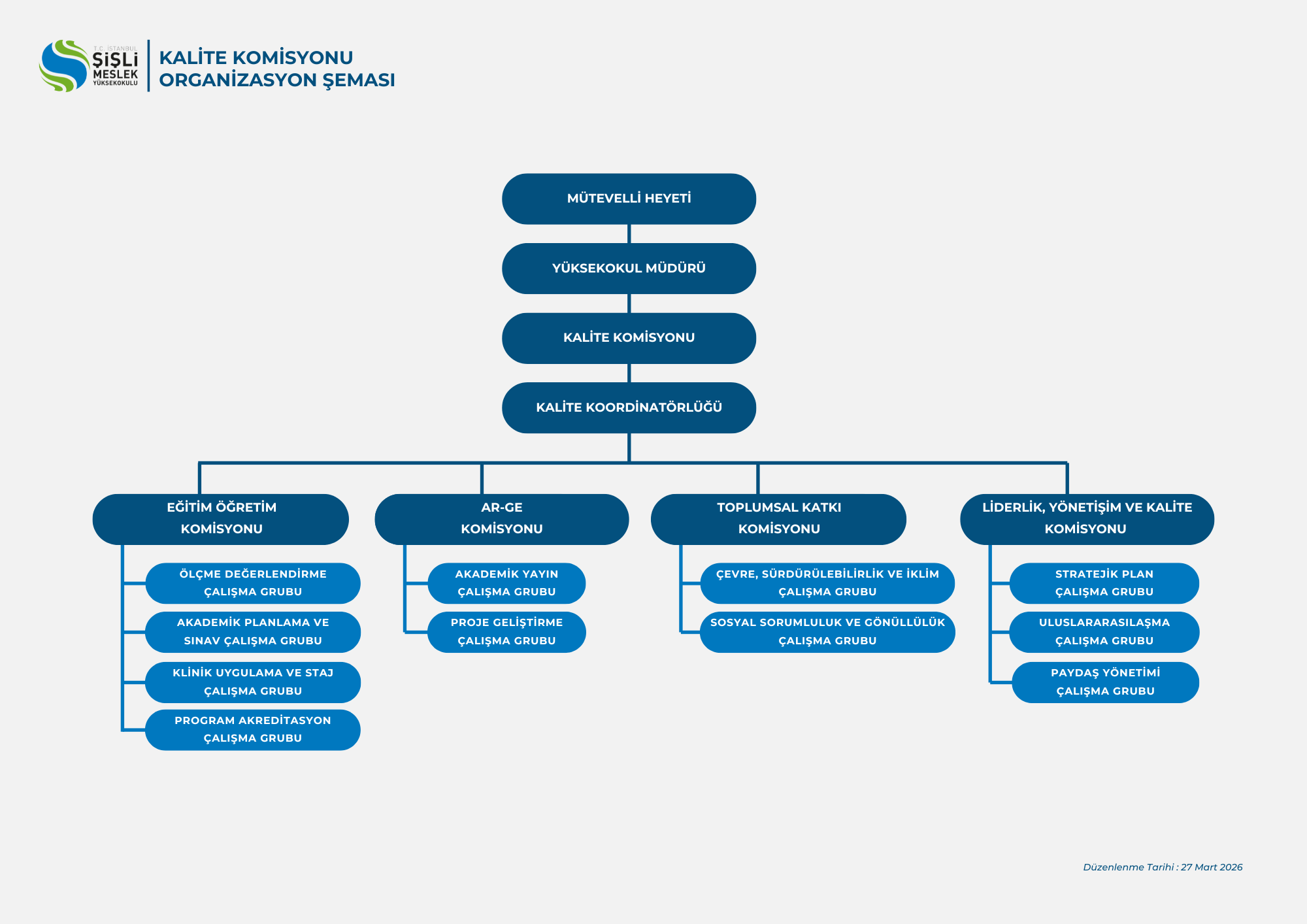İstanbul Şişli Meslek Yüksekokulu, eğitim-öğretim, araştırma-geliştirme, toplumsal katkı ile yönetim ve idari süreçlerin sürekli iyileştirilmesini sağlamak ve paydaş memnuniyetini artırmak amacıyla kurumsal kalite güvence sistemini yapılandırmıştır.